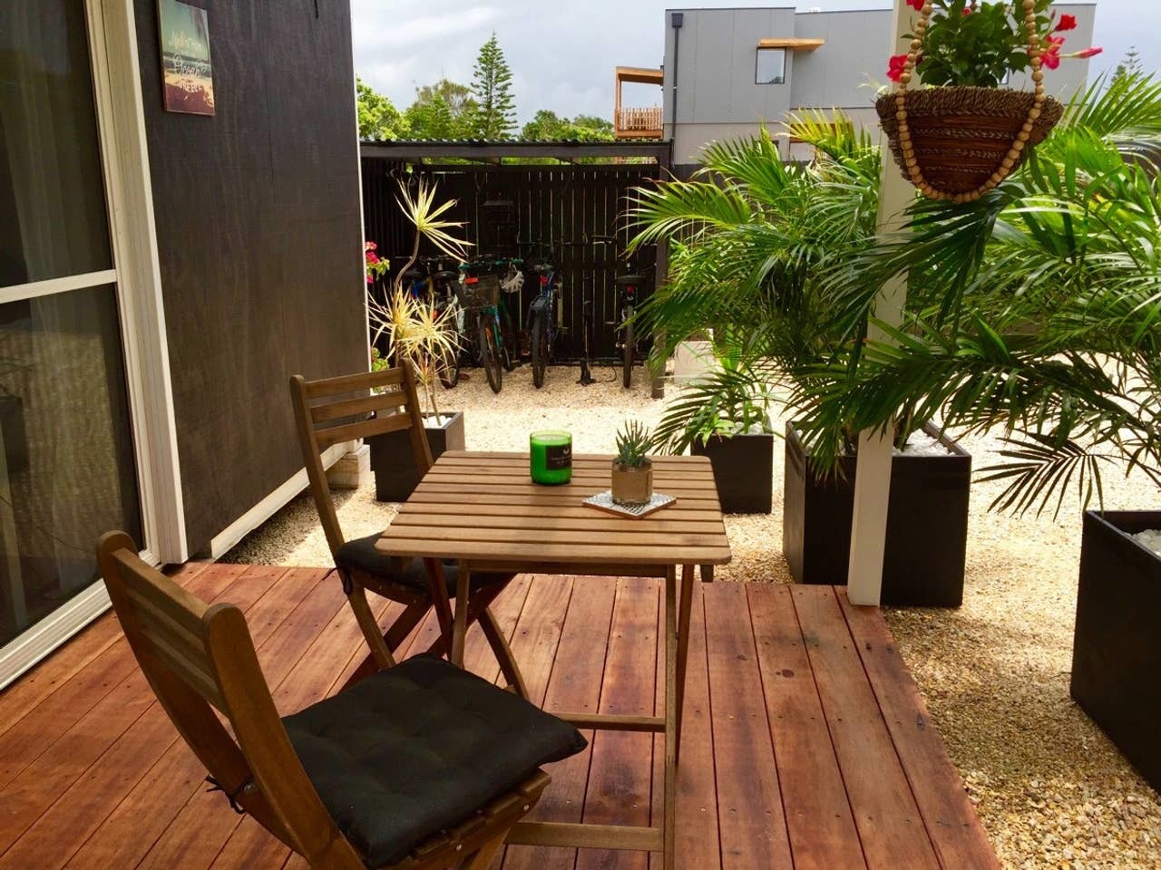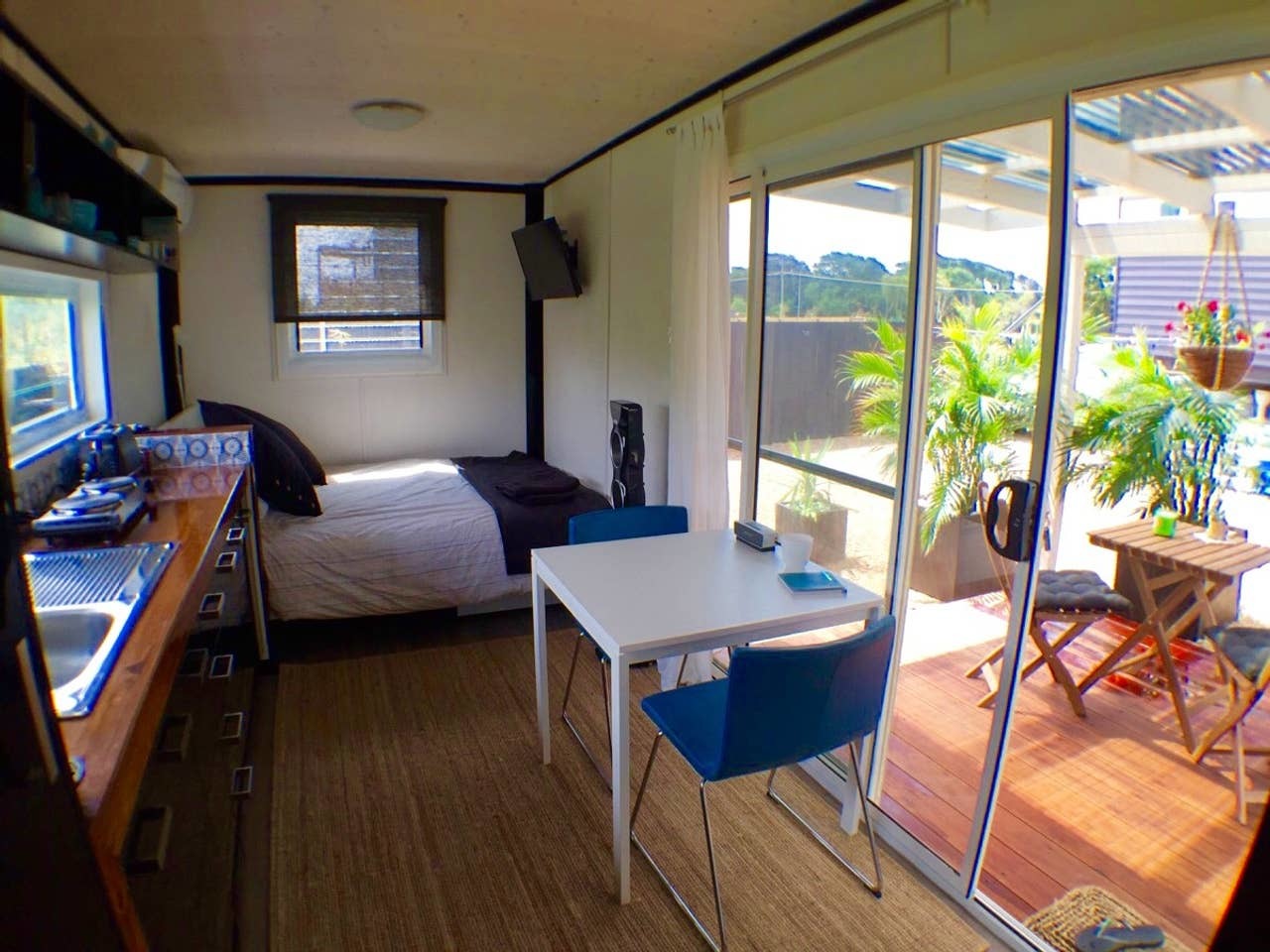 Small self contained accommodation with comforts such as air conditioning, fan, TV, Wifi and blue tooth Bose speaker. Also has its own private bathroom/shower. Nespresso coffee machine, microwave, 2 plate cooker & private BBQ, toaster/kettle & blender, outside sitting area, small bar fridge.
