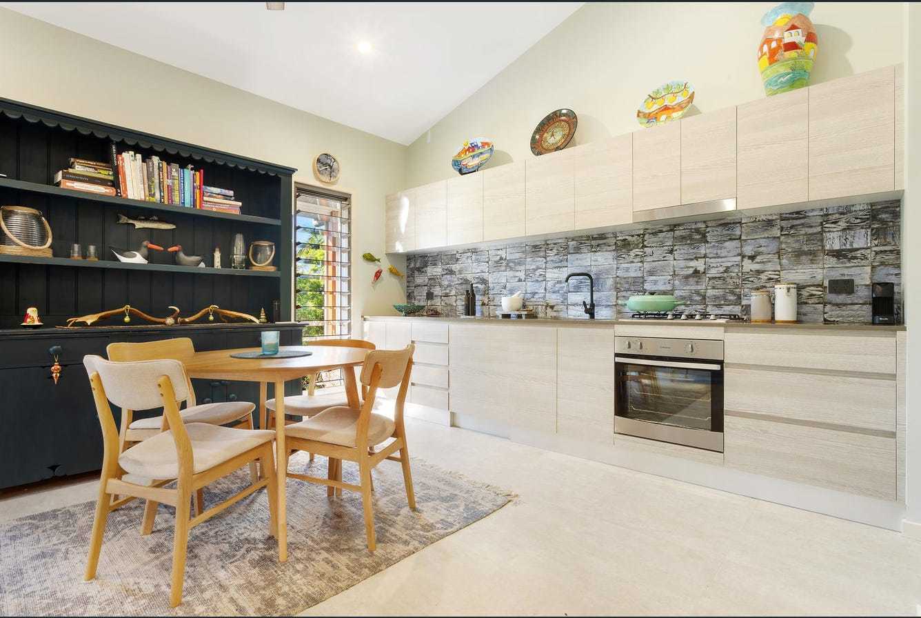 A fabulous decked outdoor area seamlessly connects to indoors which comprises an open plan kitchen, dining and lounge area with high ceiling and ceiling fan.