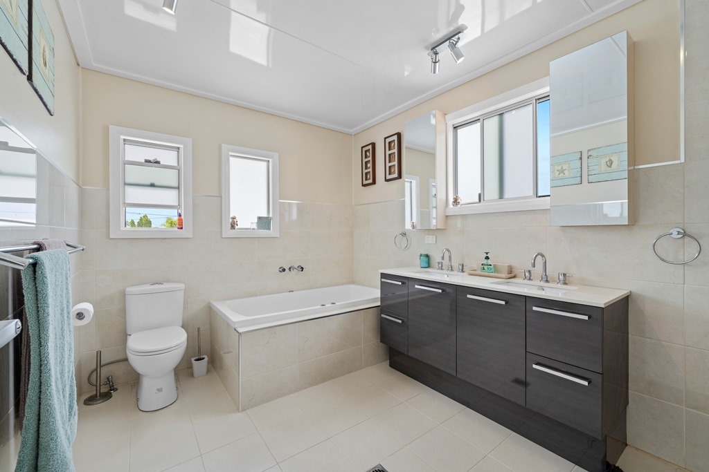Up the beautiful timber staircase to the top floor for the remaining 3 bedrooms ( 1 queen, 2 singles with a trundle and a single) plus the enormous family bathroom with a great soaking bathtub and a separate shower recess.