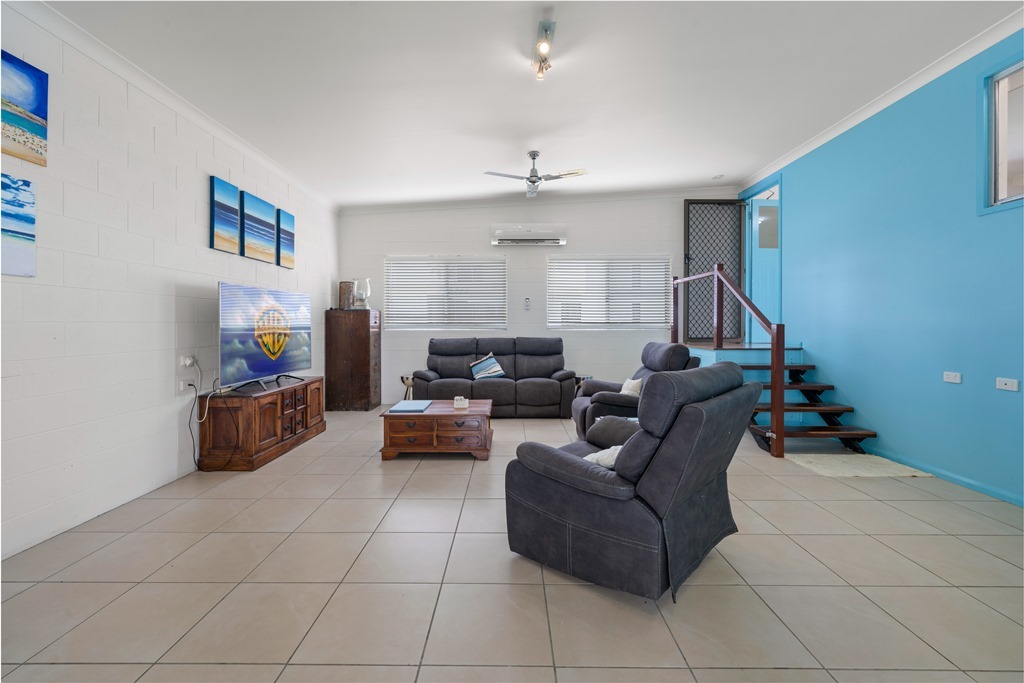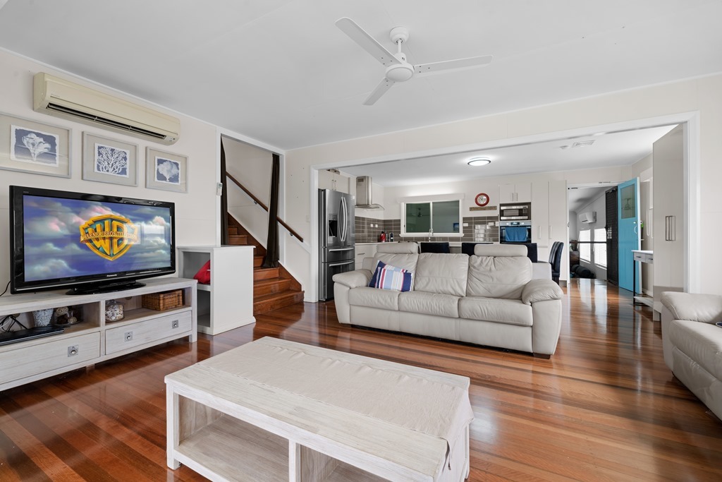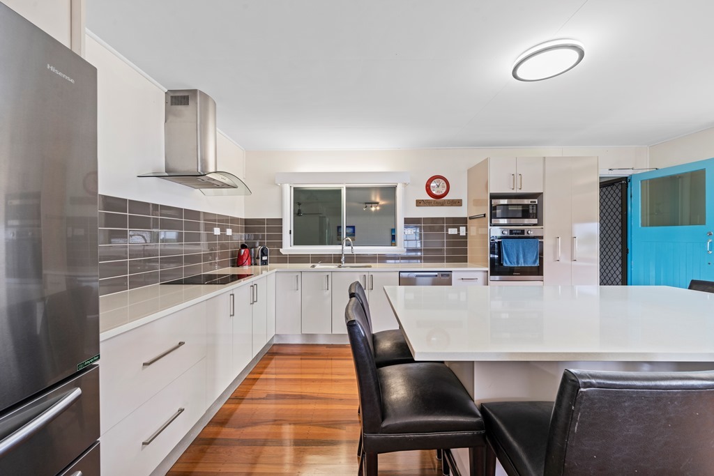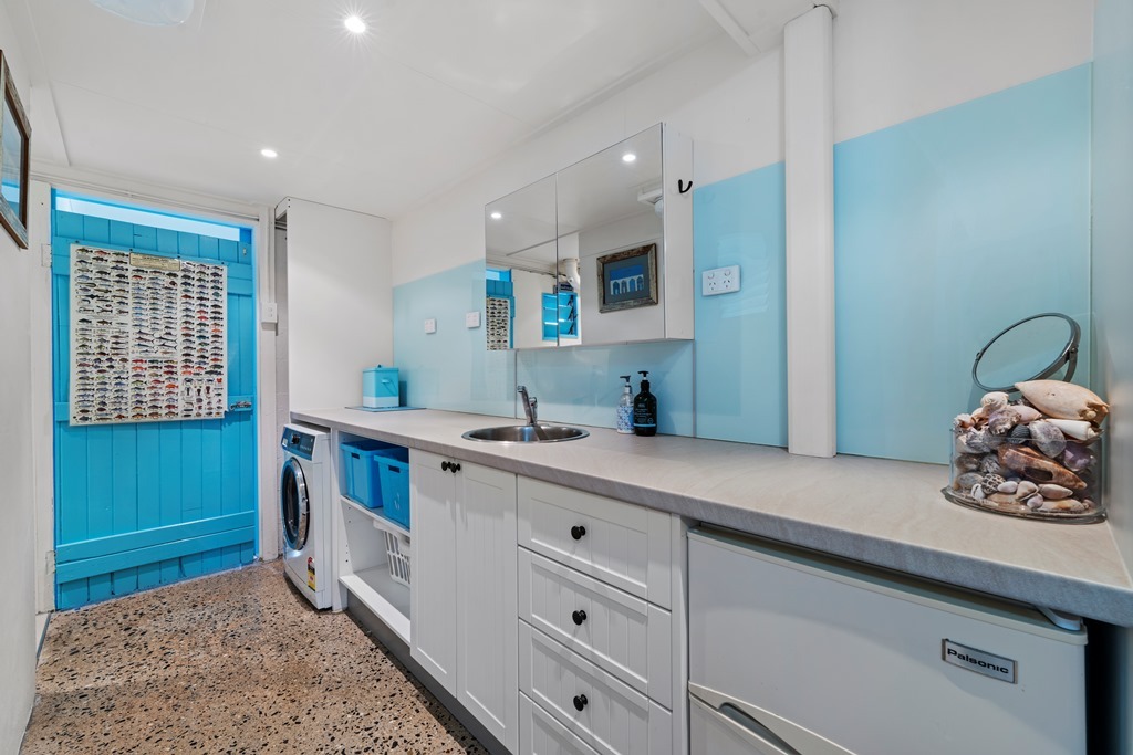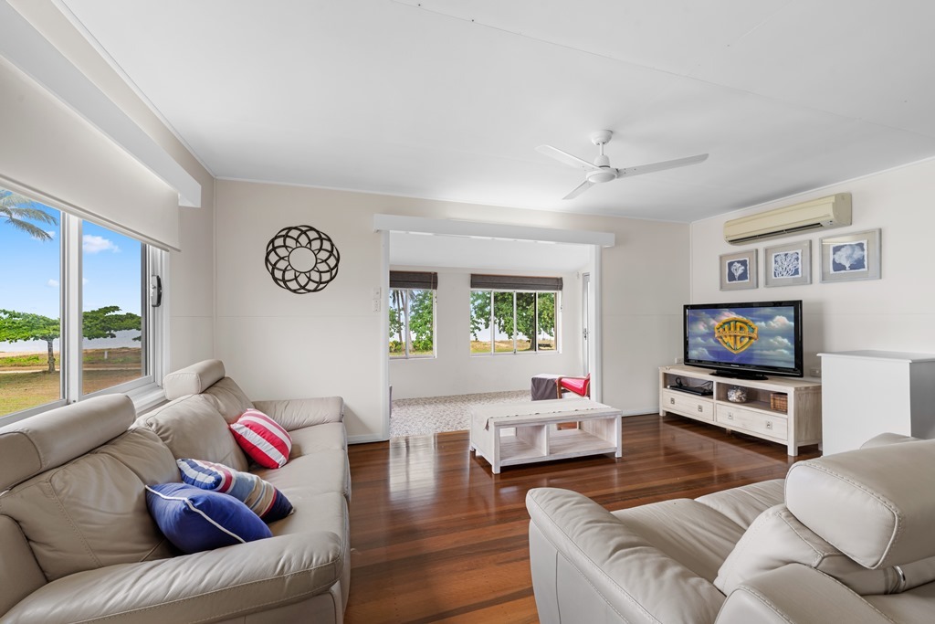 Up from the games room, you walk into an oversized chef's kitchen. Storage for miles, plenty of bench space for prep, a massive island bench that doubles as the dining table with plenty of seats to chat to the cook, a generous fridge freezer, a twin drawer dishwasher, and a full-size oven and cooktop. The beach view from the kitchen also ensures the Cook is rewarded for their hard work! The adjoining open-plan lounge room has comfy couches and a large-screen TV also with a view of the beach. Another designated sitting area on the front patio completes this level. The side door gives direct access to the beach.