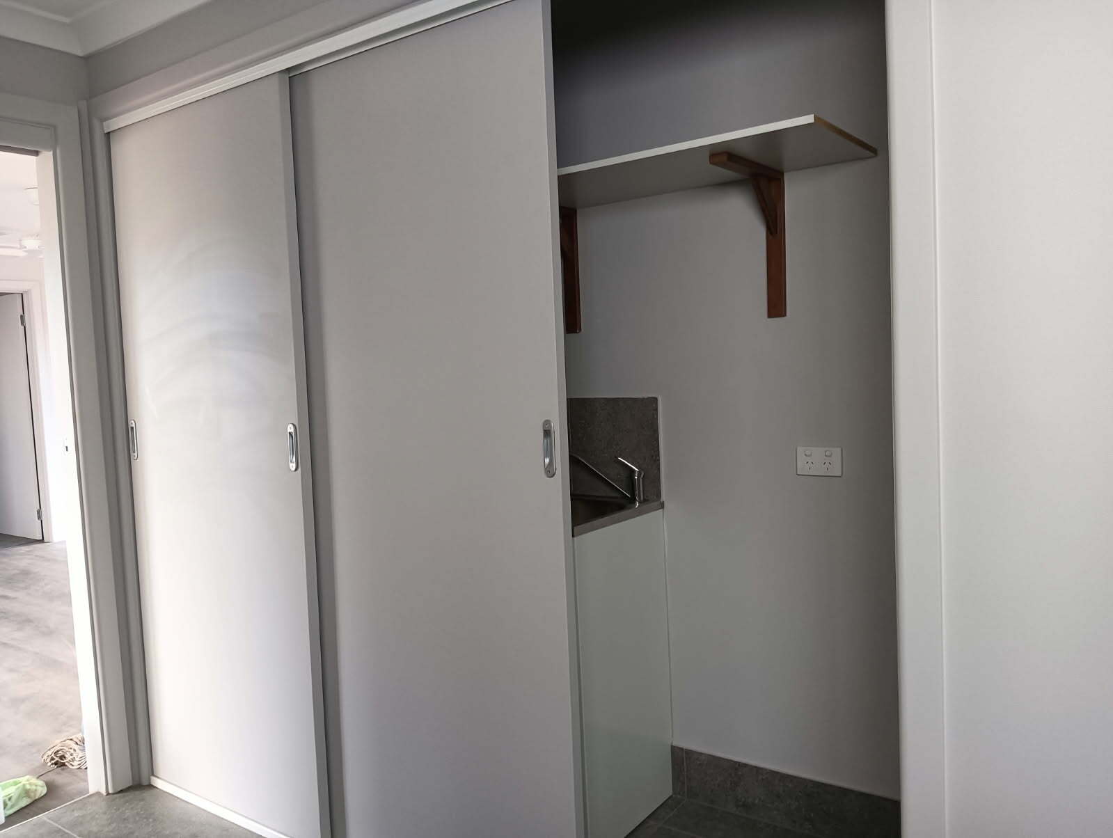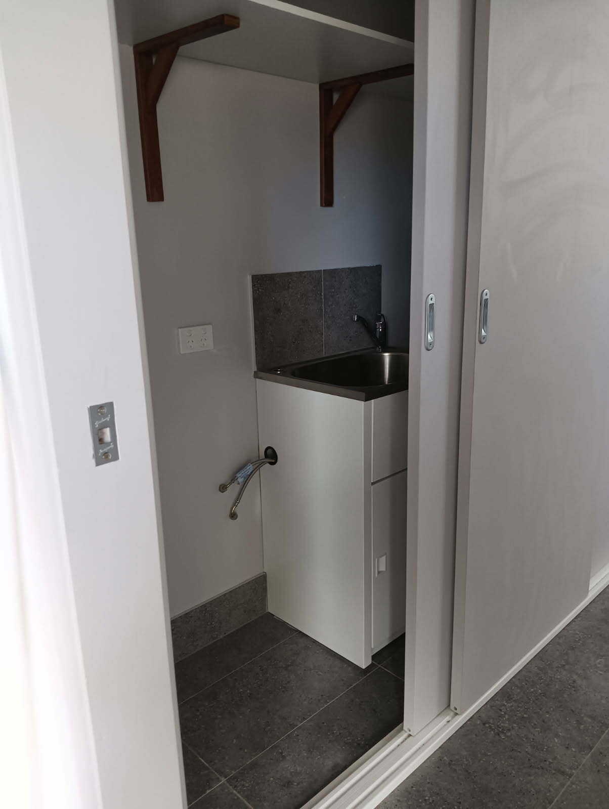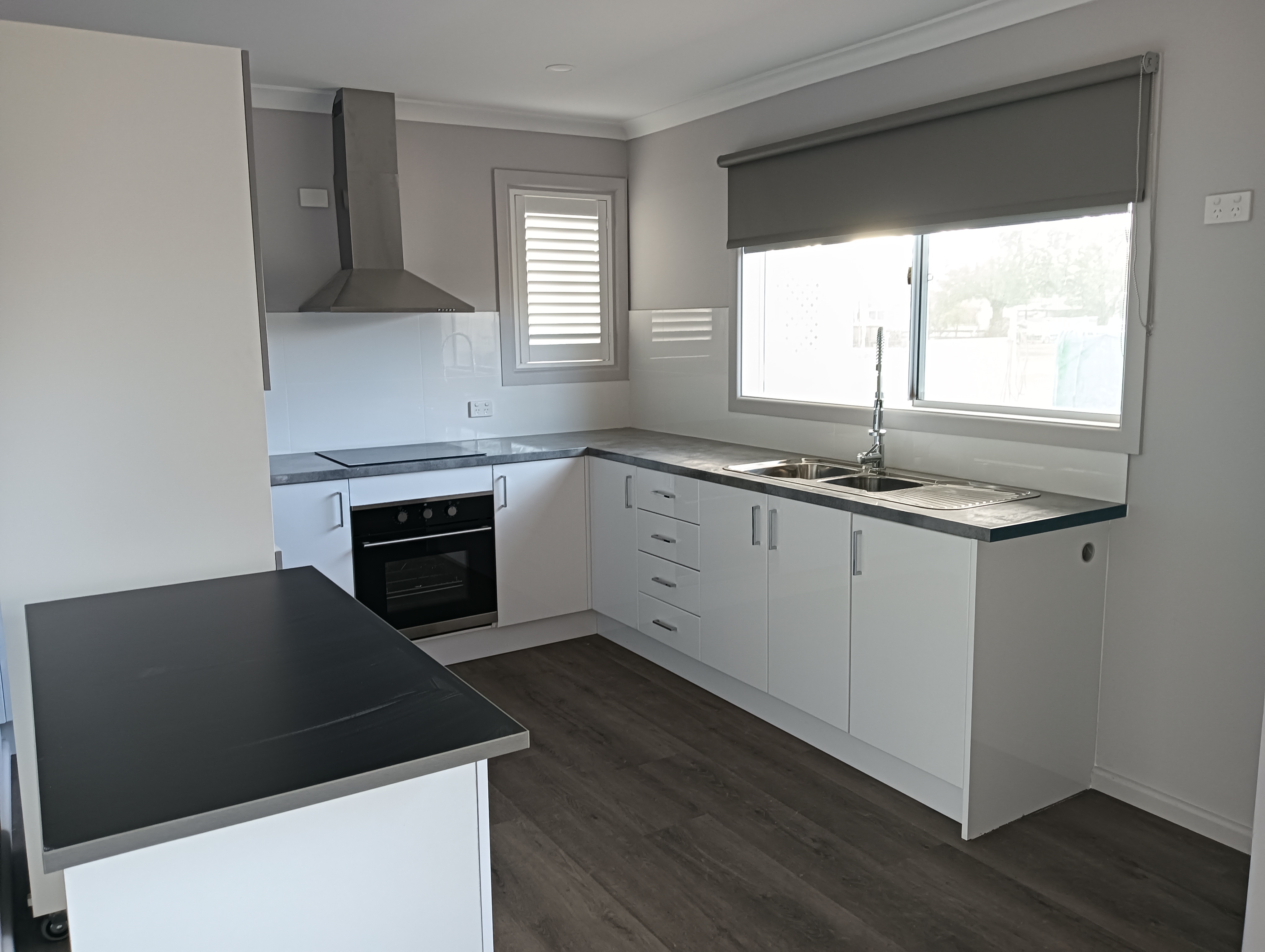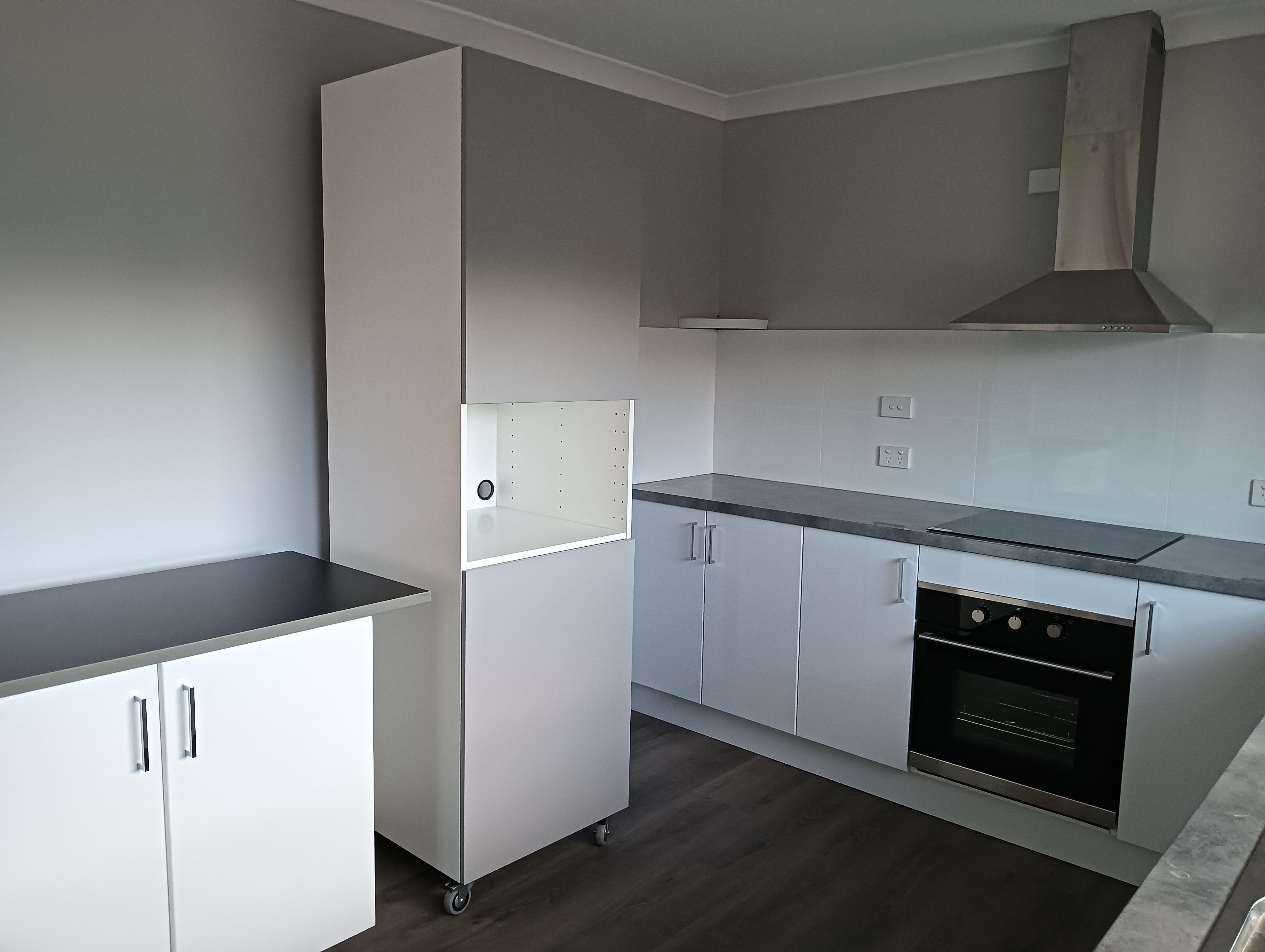 Open plan kitchen with pantry, electric cooking, microwave shelf and island bench that has lockable wheels for moving around