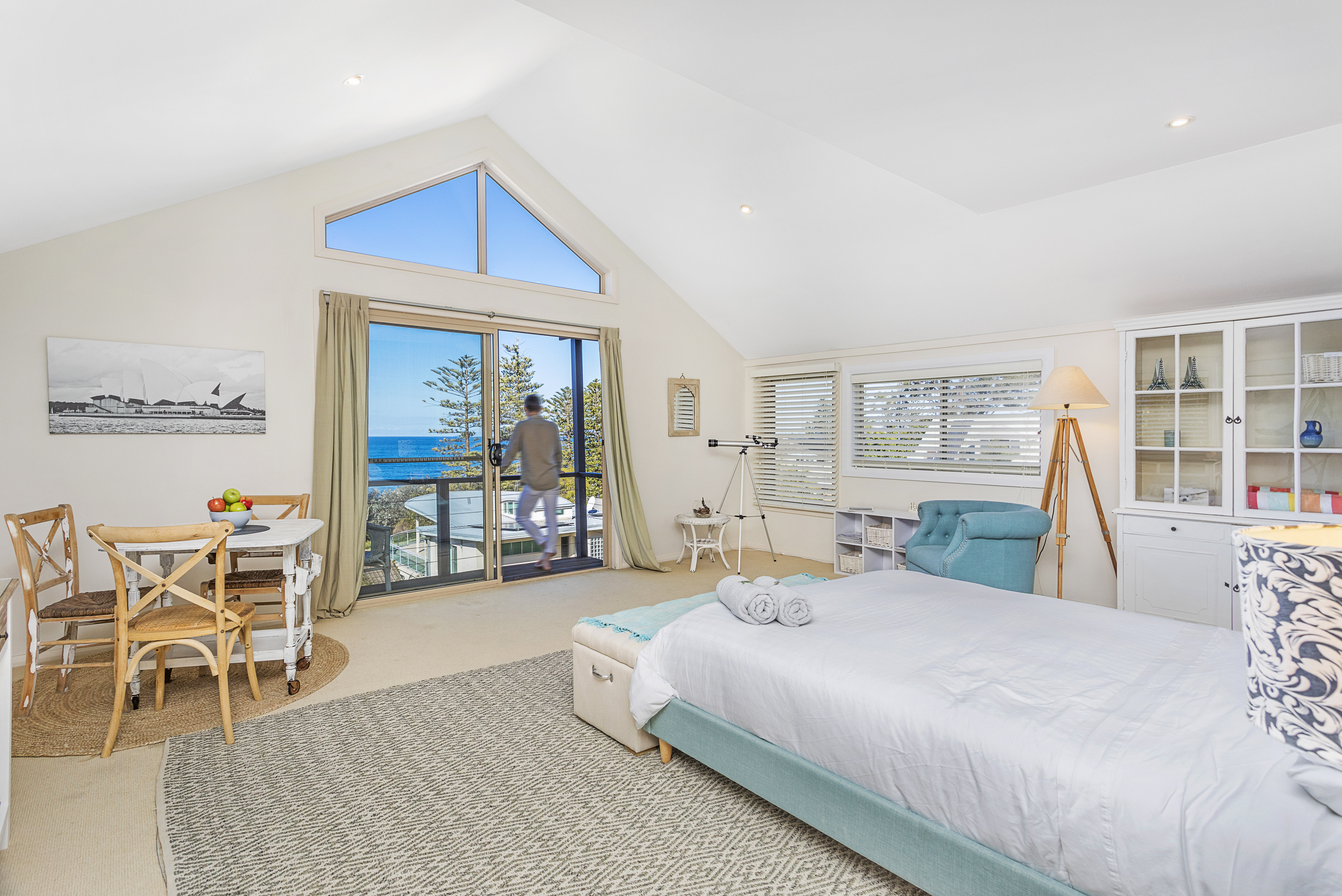 This is an amazing property with 360 degree ocean views. With a great location down the drive across directly from the well known Sharkies dog and surf beach to locals. Fully self contained with a Juliette balcony, kitchenette with large bar fridge. Open plan studio style set up as main bedroom with dining and cane sitting area looking to the ocean, with a loft separated by a barn door, with a single chaise/bed with trundle, can be used as a study space if the extra accommodation isn't required. Built in robe and free standing robe to house clothing. Massage shower head in the ensuite. Short stays also welcome. Currently not taking bookings, check back in as we will be up and running again soon, or message us for more details.